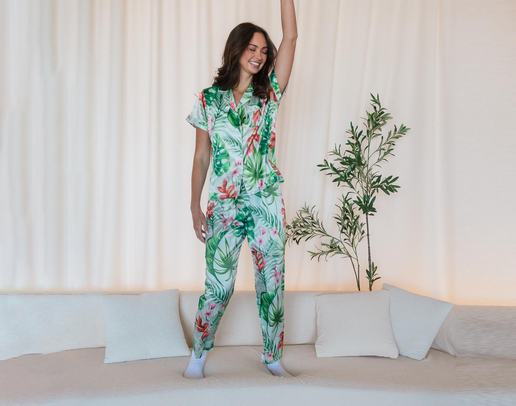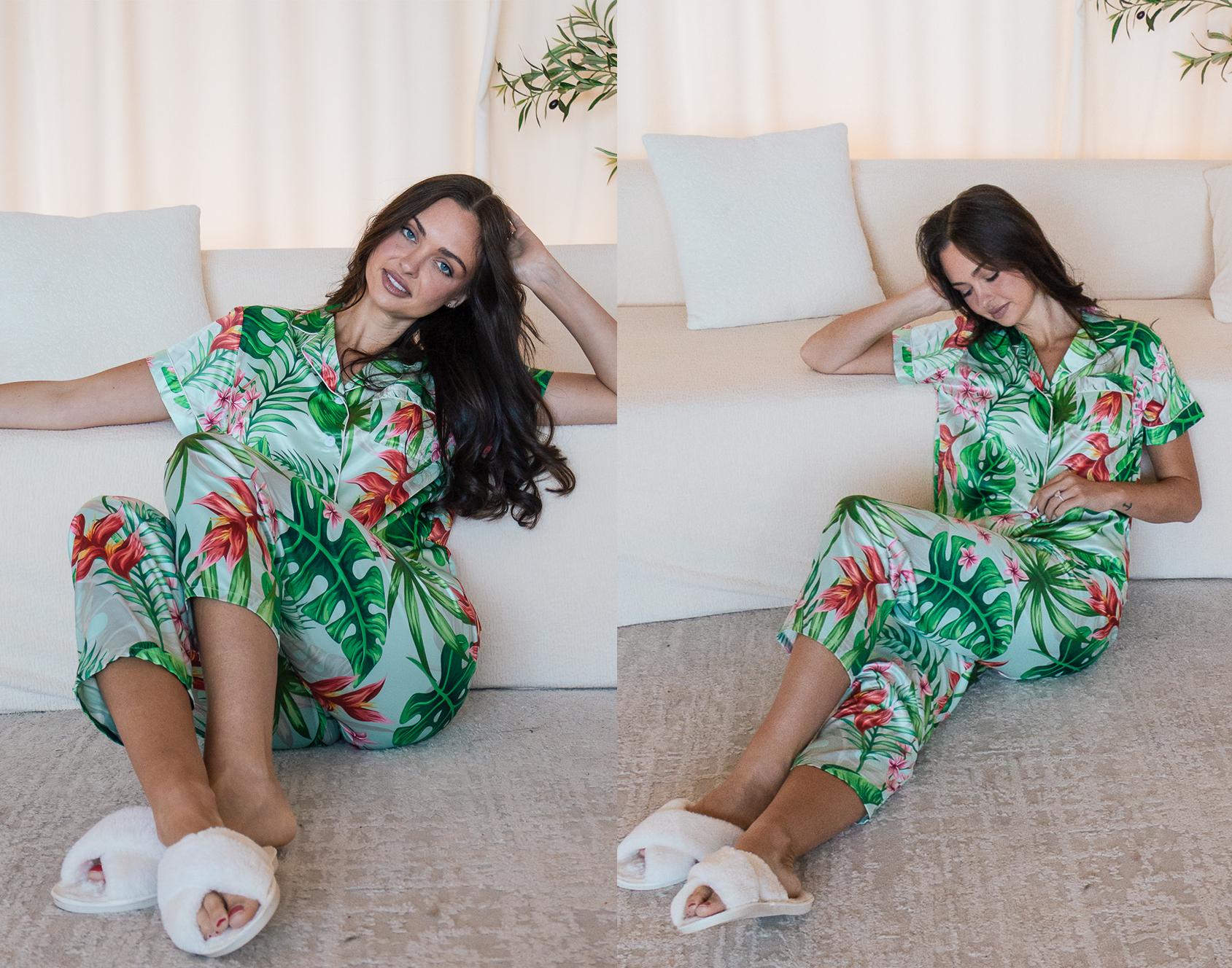 Satin Tropical Pajama Set, Banana Leaf Print Loungewear, Beach Wedding Bridesmaid Gift