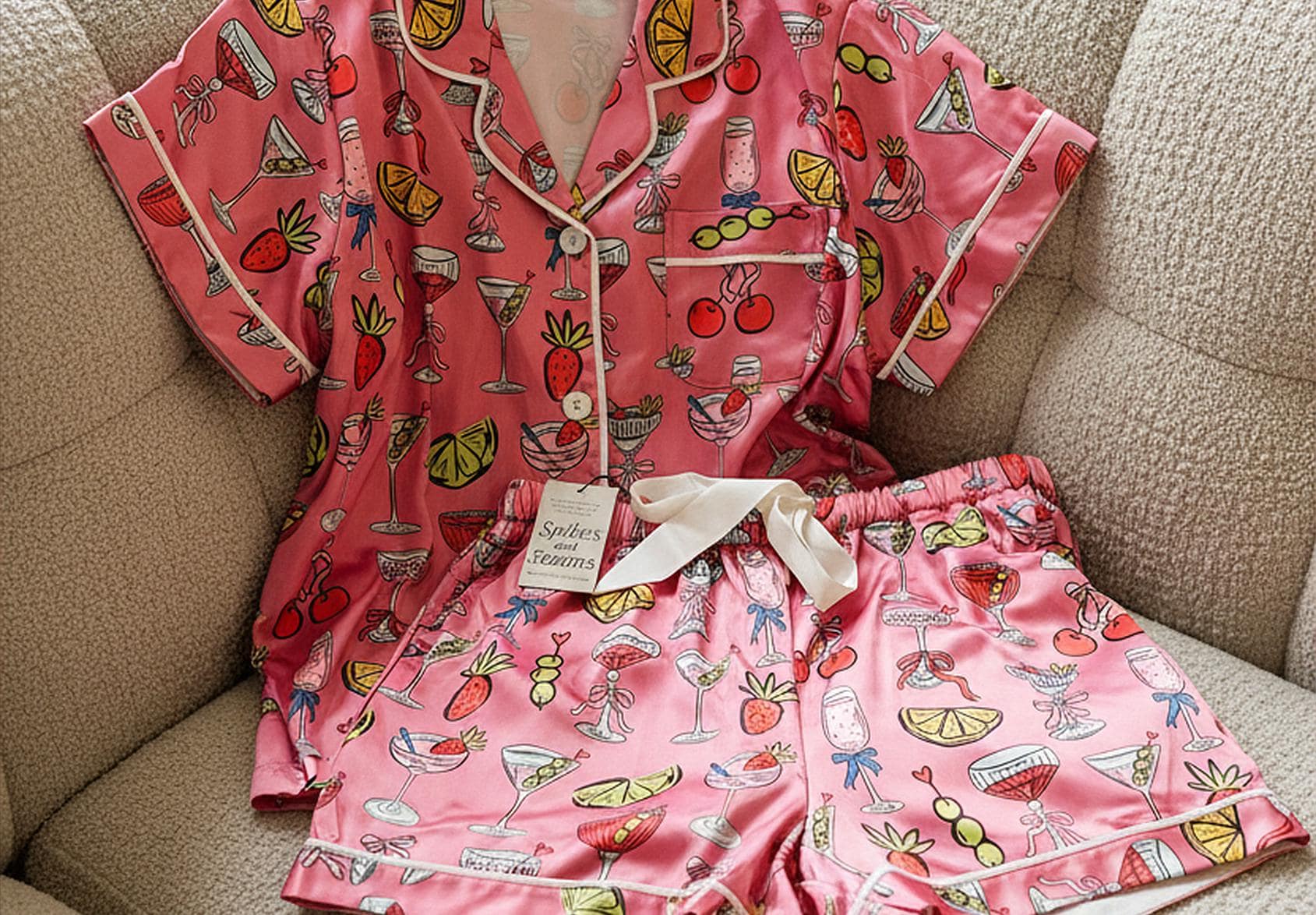 Sip, sleep, & sparkle in our Cheers to Bedtime Satin Pajamas, the perfect set for cocktail snobs and spritz lovers! Adorned with playful motifs of cute cocktails🍸, citrusy fruits🍋, and juicy cherries🍒.