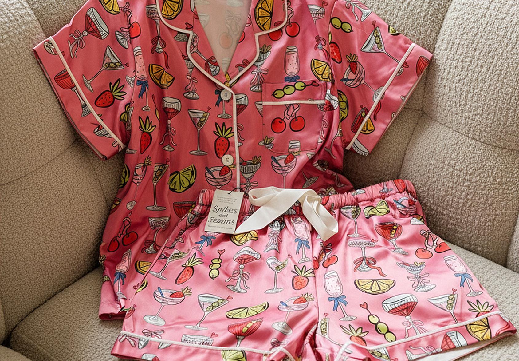 Cocktail Print Satin Pajamas, Printed Silk Sleepwear, Bachelorette Party Pajamas, Girls Night, trendy pink pajamas, printed pattern pajamas