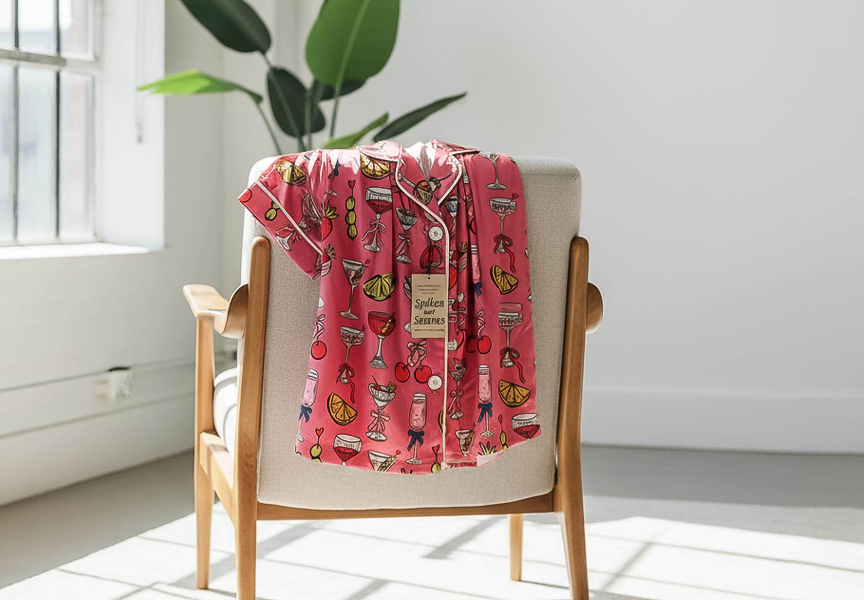 Sip, sleep, & sparkle in our Cheers to Bedtime Satin Pajamas, the perfect set for cocktail snobs and spritz lovers! Adorned with playful motifs of cute cocktails🍸, citrusy fruits🍋, and juicy cherries🍒.