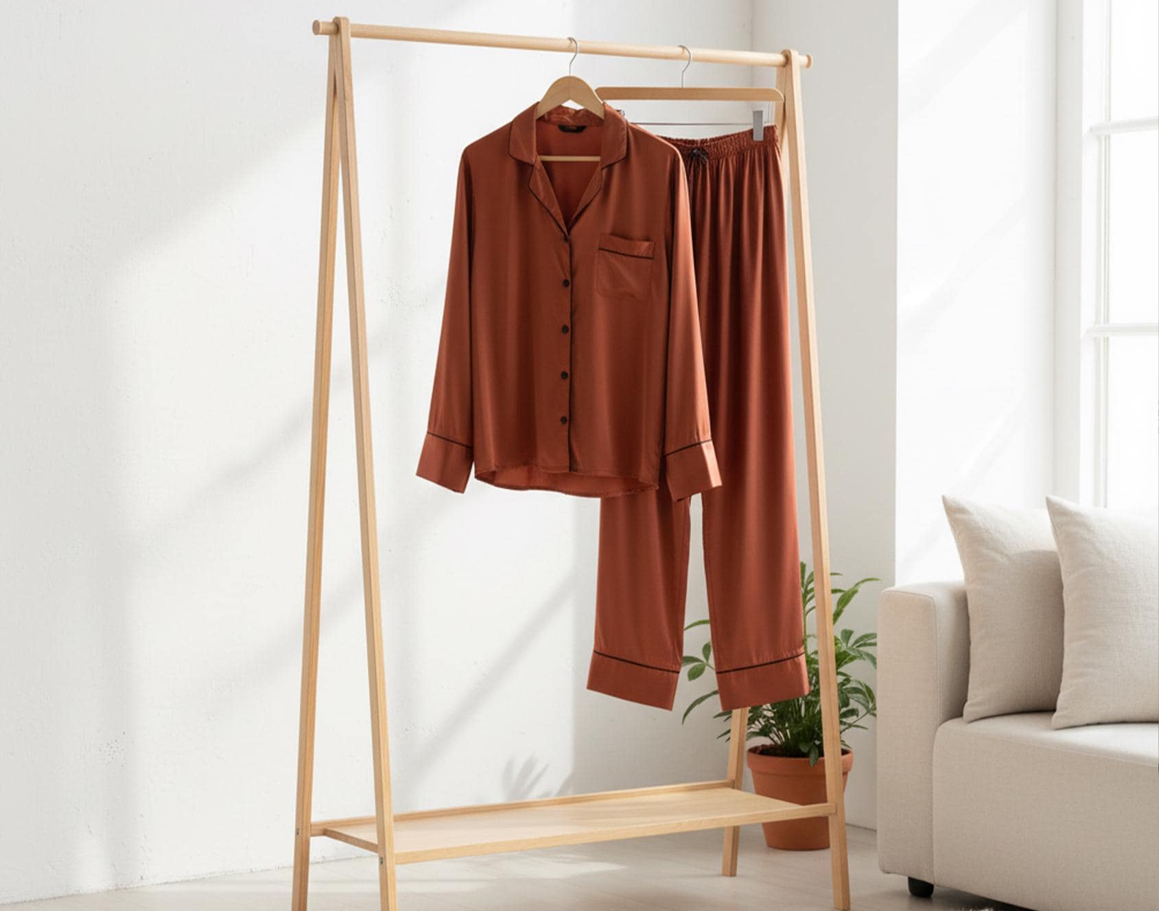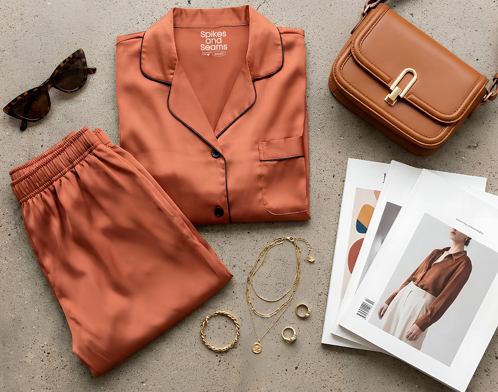 Our burnt orange silky satin pajama pants set wraps you in a warm, glowing sheen, like cozying up inside a golden hour sunset. Made from an irresistibly soft satin and spandex blend, this set is ultra-light, and buttery smooth against your skin.