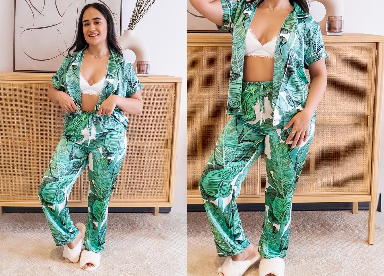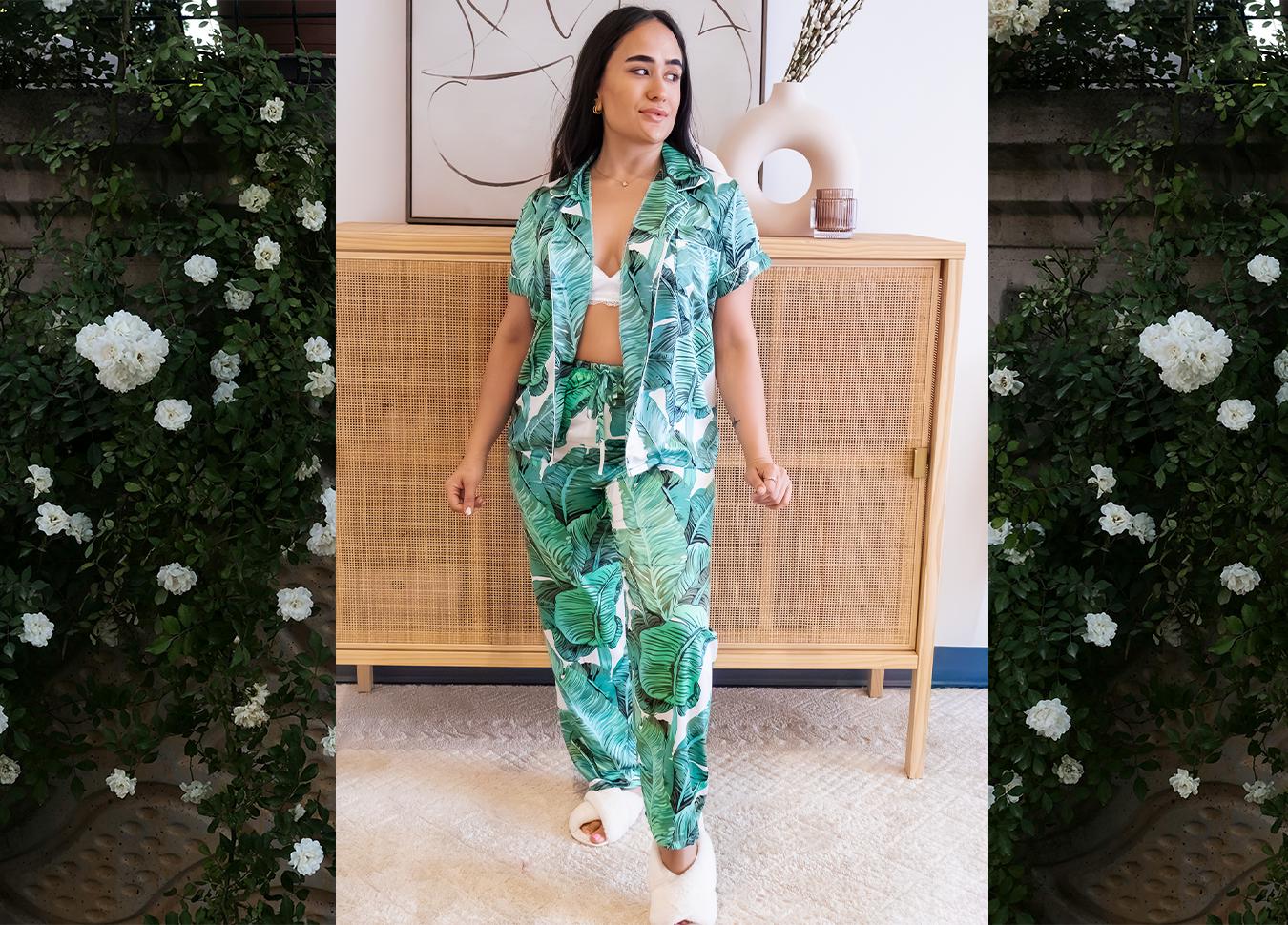 Effortless luxury for quiet mornings. This satin set pairs a lush green banana leaf print, an adjustable drawstring waist, and is made from a lightweight satin that feels cool and smooth against the skin.
